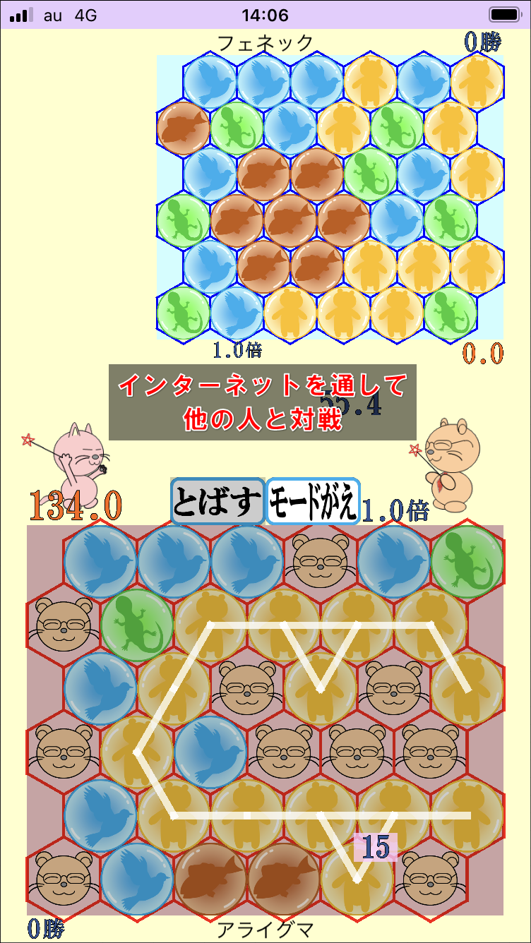 オンライン対戦は、インターネット通信(キャリア通信やWi-Fiなど)でサーバーを通して相手とゲームデータをやり取りしながら対戦をします。このゲームでは、簡易的な通信方式で、できるだけ少ない通信量で、できるだけ少ない通信回数で、オンライン対戦を実現するようにしています。