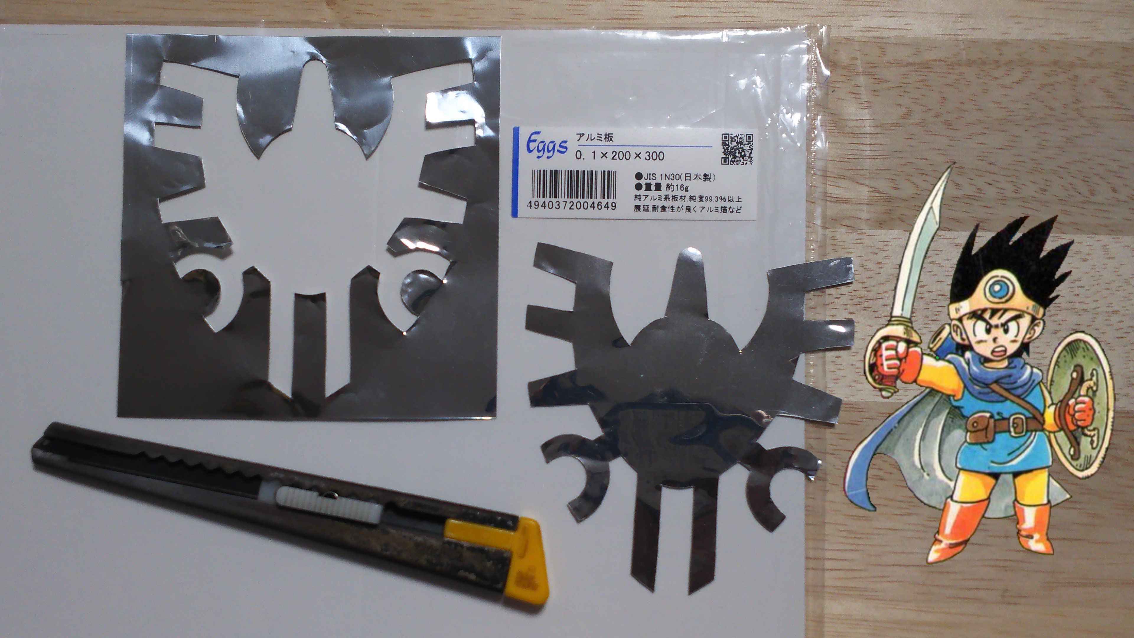ホームセンターで買ってきた厚さ0.1ミリメートルのアルミ板(アルミホイルでも可能)を、ドラゴンクエスト(ドラクエ)のロトのマークの形に切り抜いてみました。