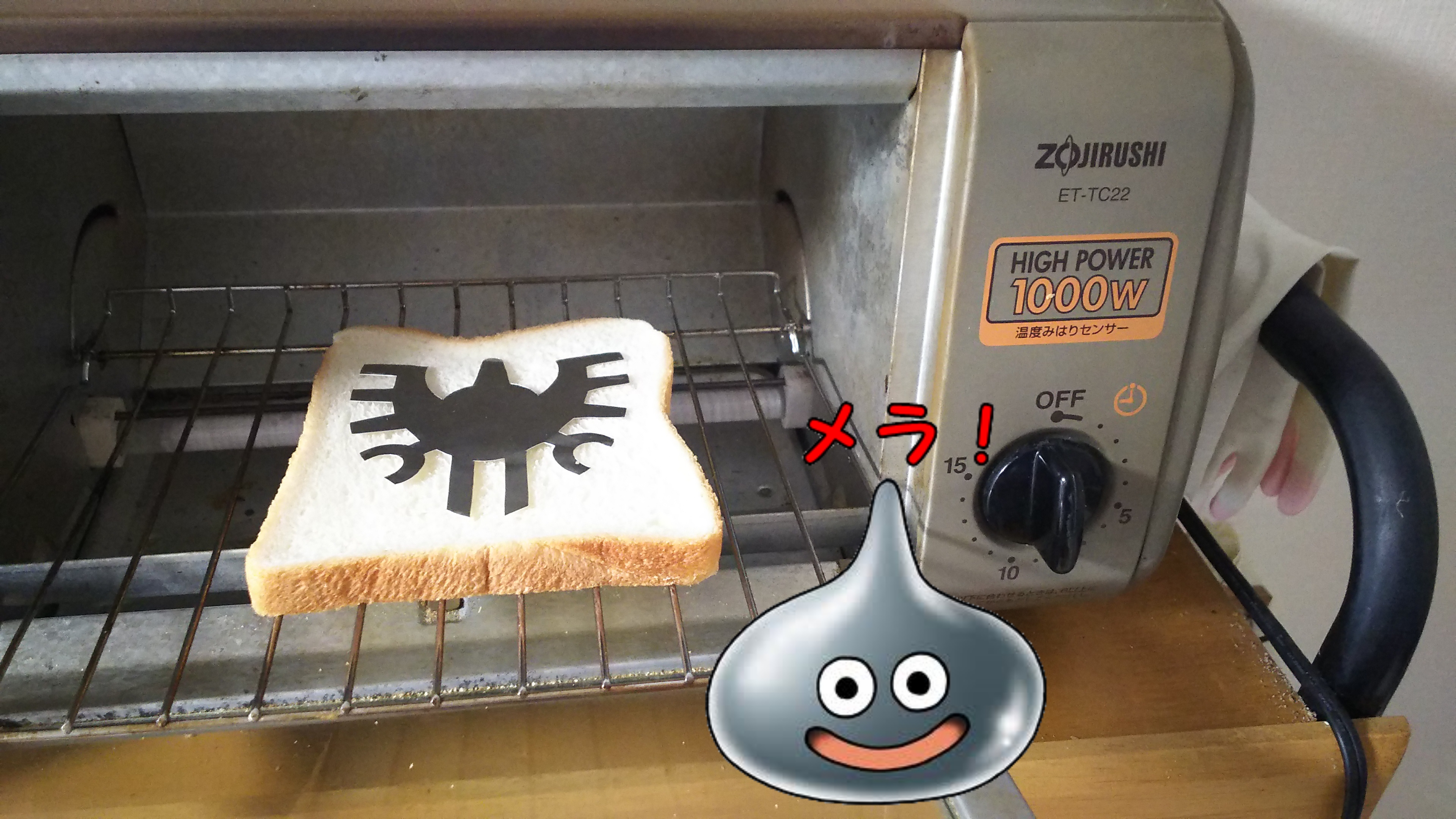 食パンの上に、切り抜いたアルミ板を乗せて、オーブントースターで焼いてみます。メラで焼けるかなー。