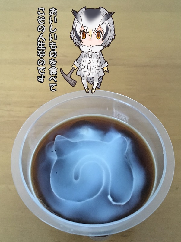 普通のコーヒーゼリーに、けものフレンズ的な型をちょっと押し付けて、ミルクをちょっとかけたら、けものフレンズ的なコーヒーゼリー(じゃぱりこーひーぜりー?)になるのではないかと思い、やってみました(型を作った時の写真はこちらのページ)。その過程を、「おすすめの場所をめぐろう」というスマートフォン用アプリを使ってキャラクターとの合成写真で撮ってみました。