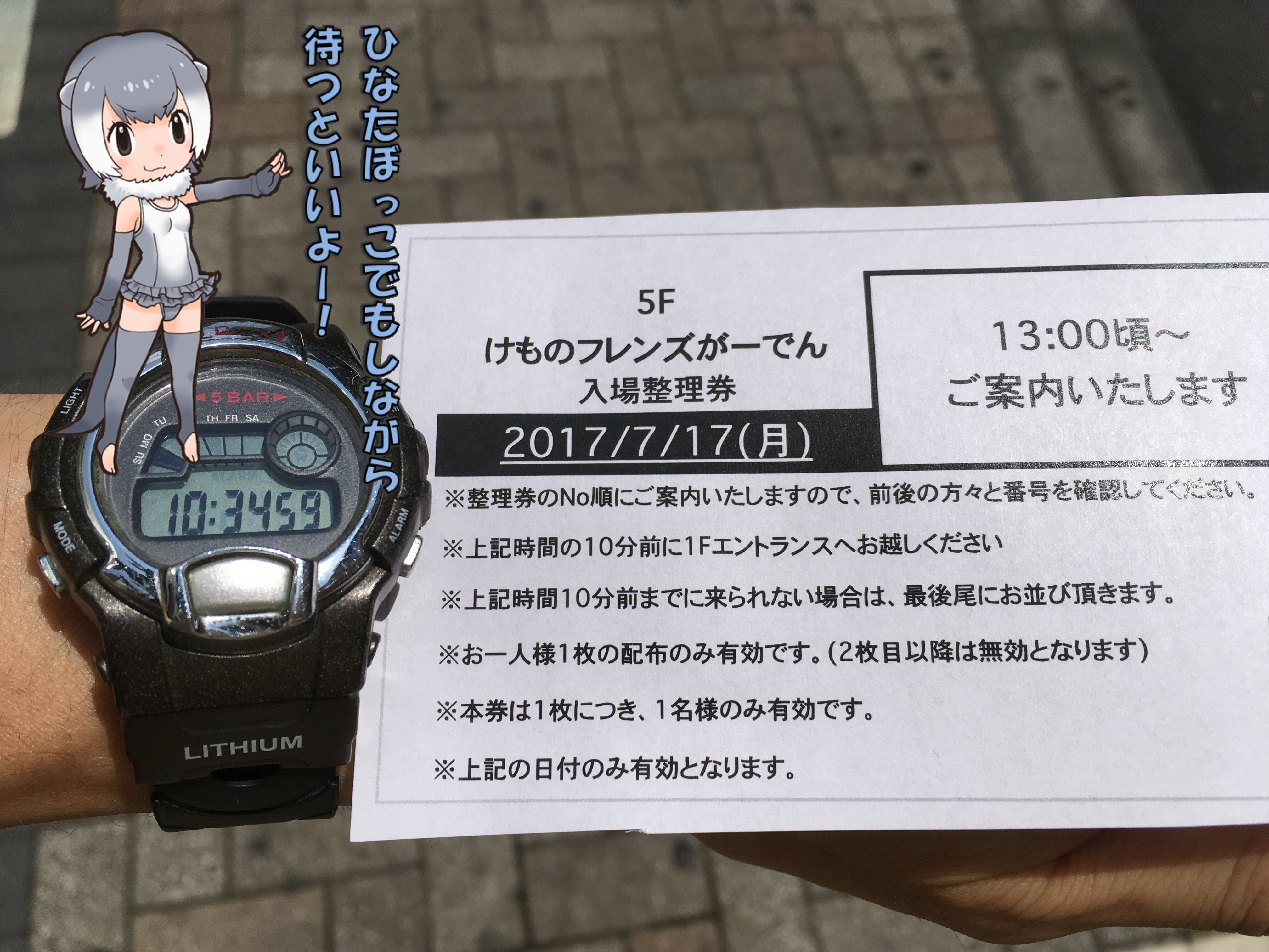 「けものフレンズがーでん」の建物の外で、「けものフレンズがーでん」の入場整理券をもらいました。まだあと2時間半くらいありますね。まあ、「ひなたぼっこでもしながら待つといいよー!(コツメカワウソさんふうに)」っていう感じですかね。