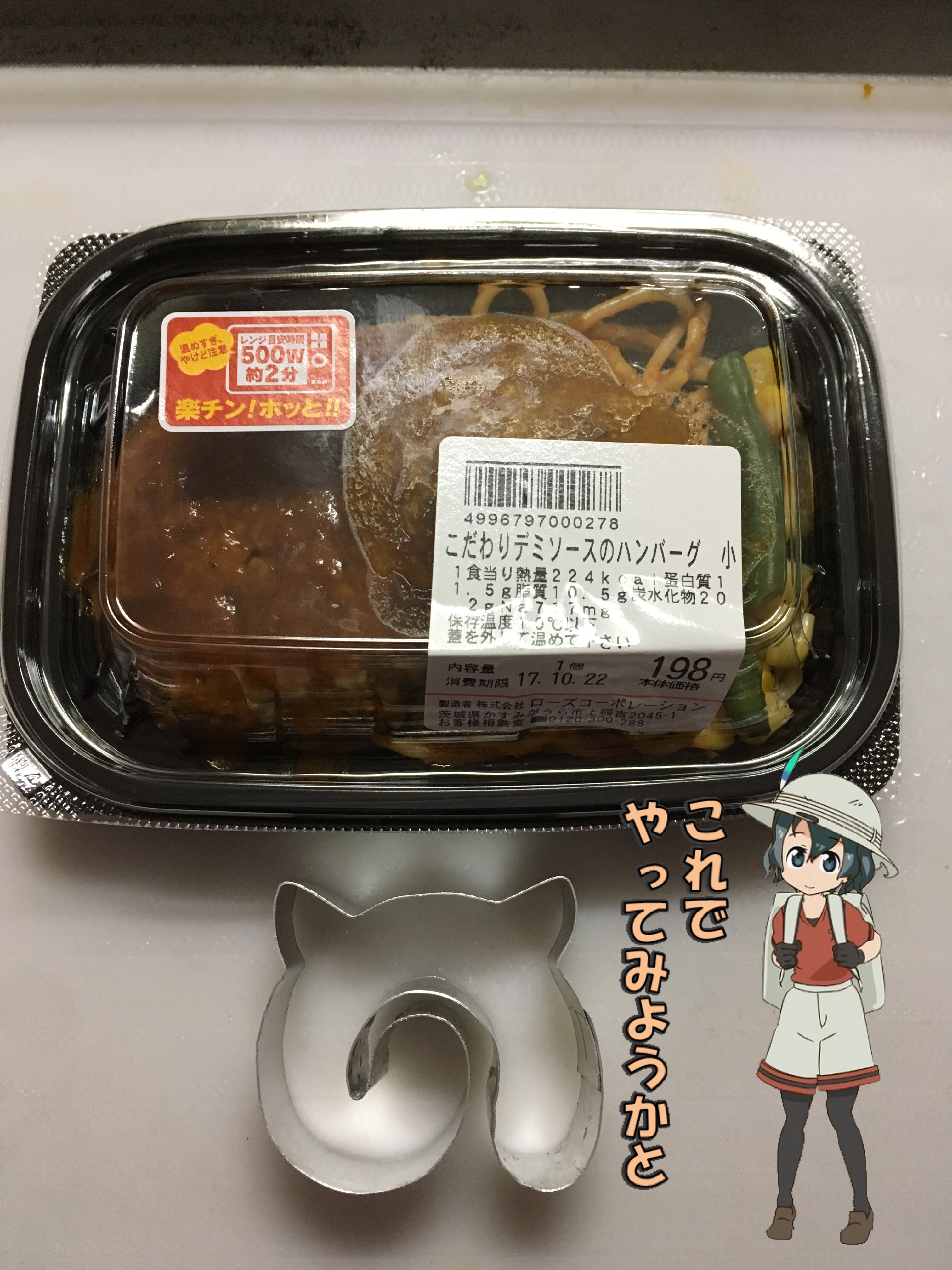 すでに出来上がっているハンバーグをスーパーマーケットで買ってきて、けものフレンズの「の」の型で型抜きすれば、けものフレンズ的なハンバーグ(じゃぱりはんばーぐ?)が作れるのではないかと思い、やってみました(型を作った時の写真はこちらのページ)。その過程を、「おすすめの場所をめぐろう」というスマートフォン用アプリを使ってキャラクターとの合成写真で撮ってみました。