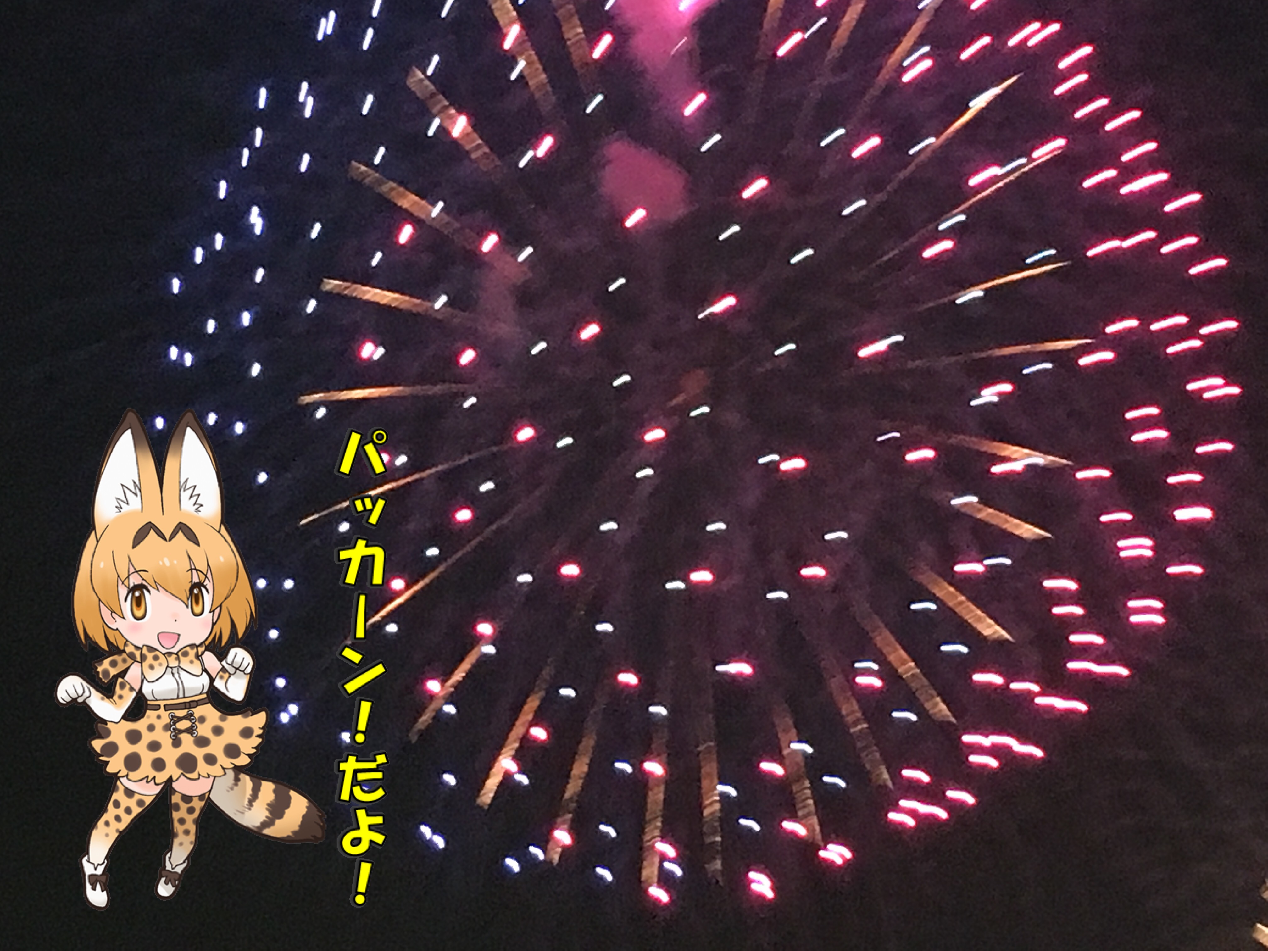 色のついた打ち上げ花火が開く瞬間の写真をうまく撮れば、けものフレンズでセルリアンをパッカーンと倒した時みたいな感じの写真が撮れるかもしれないと思い、「おすすめの場所をめぐろう」というスマートフォン用アプリを使って撮ってみた合成写真です。