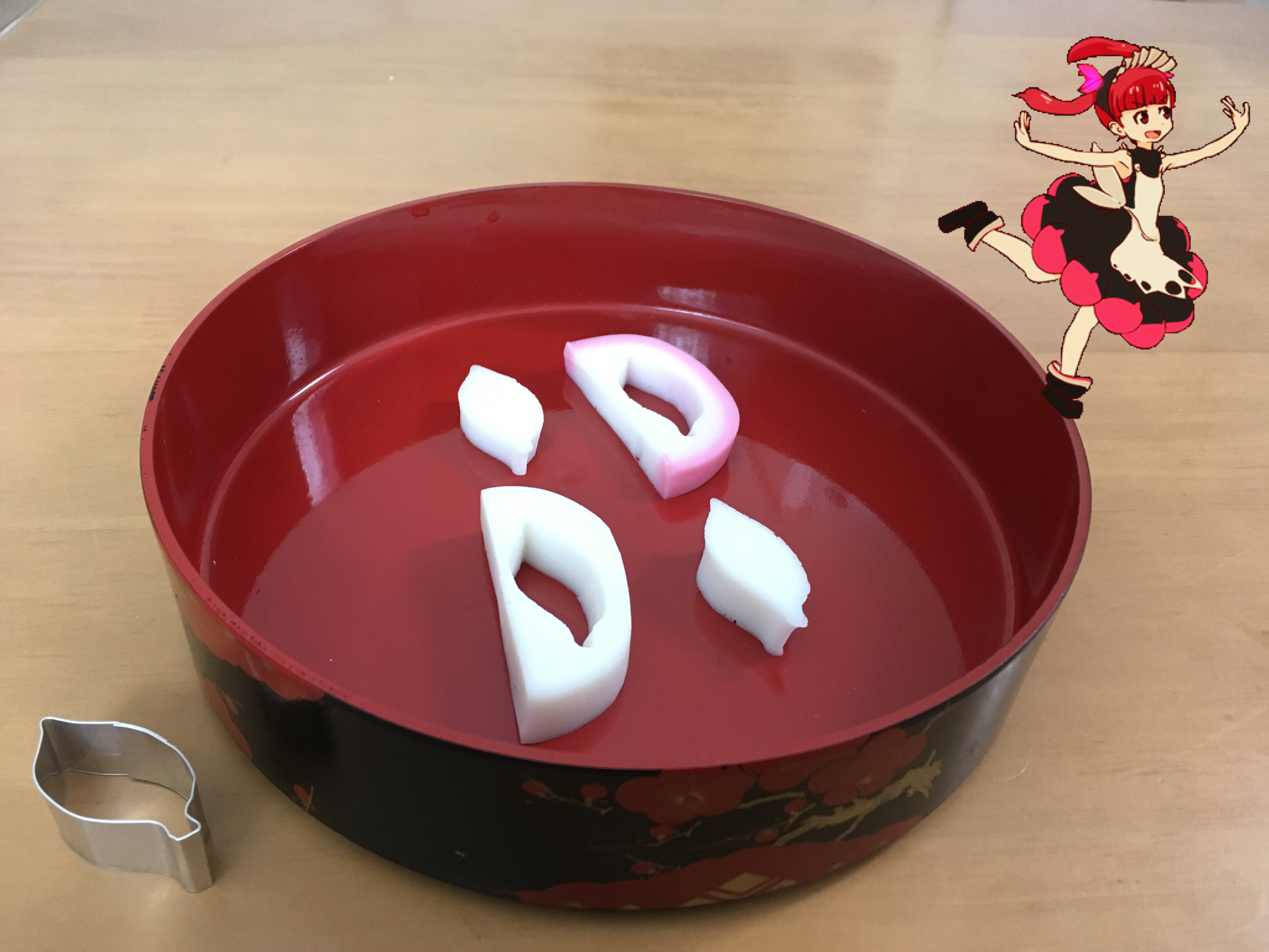 お正月のおせち料理のかまぼこを、ケムリクサのりんの手のひらの上の葉っぱ(?)のような形に型抜きしてみたのを撮った写真です。