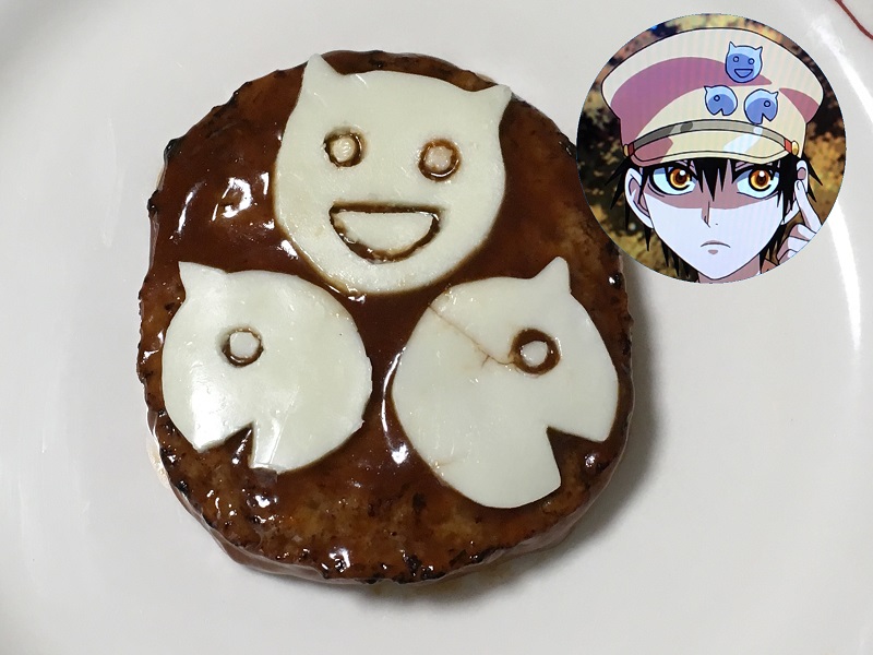 スライスチーズを群青のマグメル(拾又之国)の因又(イン・ヨウ)の帽子のバッジの形に切り抜いて、ハンバーグの上に乗せてみたのを撮った写真です。