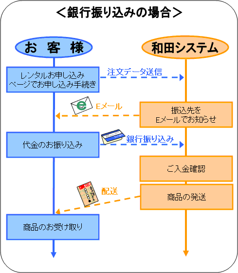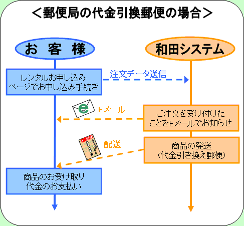 郵便局の代金引換郵便 または 銀行振り込み[先払い](ご注文の際にご指定ください)となります。 レンタル期間の延長時及びレンタル製品の購入時の料金の支払い方法は、銀行振り込みとなります。