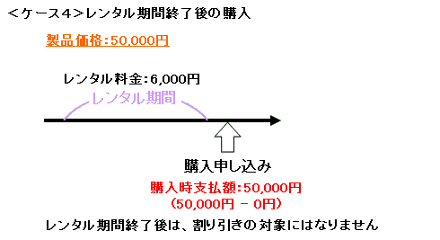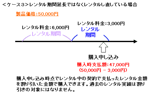 レンタル製品をそのまま購入したい場合は、レンタル期間終了日までに 和田システムお問い合わせ先 にご連絡ください。 レンタル中の契約で支払ったレンタル金額を割り引いた金額で製品を購入できます。 レンタル延長期間中の場合、当初のレンタル期間とそれ以降すべてのレンタル延長期間のレンタル料金が割り引きの対象となります。 レンタル期間の延長を繰り返して、レンタル料金の総額が製品価格に達した場合、製品を購入されたものとして取り扱います(それ以上料金を支払う必要はありません。分割払いをしたようなかたちとなります)。