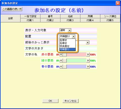 - 各項目の配置について、「左詰め」「右詰め」「中央詰め」「均等割り」から選択できます。