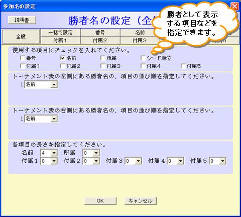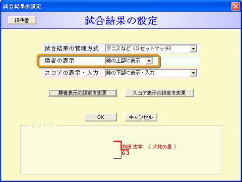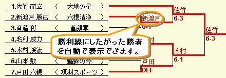 線の上部または下部に、勝利線にしたがって勝者を自動で表示させることができます。 勝者として表示する項目(例えば名前のみ)などを指定できます。