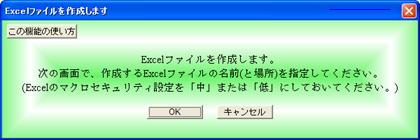 Excelファイルを作成するには、お使いのコンピュータでMicrosoft Excelが 動作することが必要です。Excelのマクロという機能を使用するので、Excelのマクロ が動作できるようにしておく必要があります。