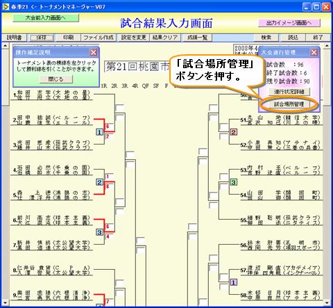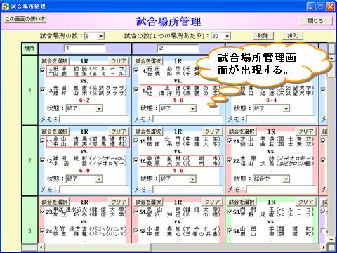 ◆試合場所管理画面で、各試合場所の状態(どの試合が、行われているか・行われる予定か・行われたか) が管理できます。