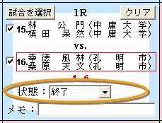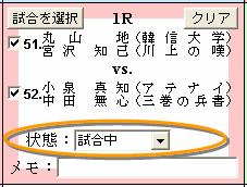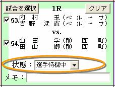 試合の状態を、選択肢から選択するだけで管理できます。選択した状態によって、 枠の色が変わります。トーナメント表・試合待ち一覧に表示される場所名の背景色も 状態によって変わります。