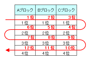 - 各ブロックの1位どうしの順位付けは、先頭の方のブロックが高いものとする。