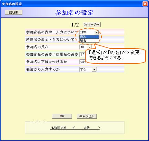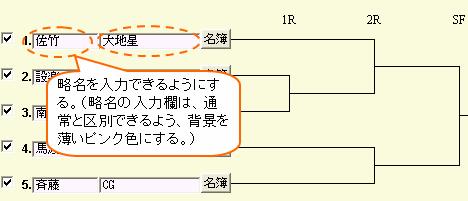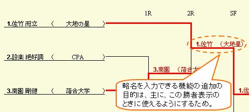※略名を入力できる機能の追加の目的は、主に、勝者表示のときに使えるようにするため です。勝者表示はたいてい表示場所が狭いため、通常の参加名を表示すると見にくくなって しまいます。