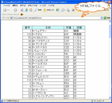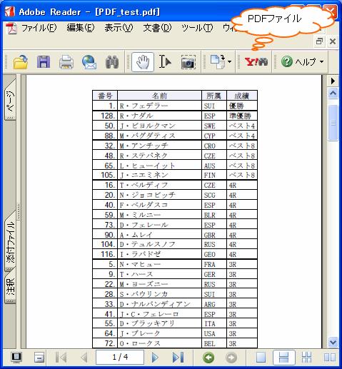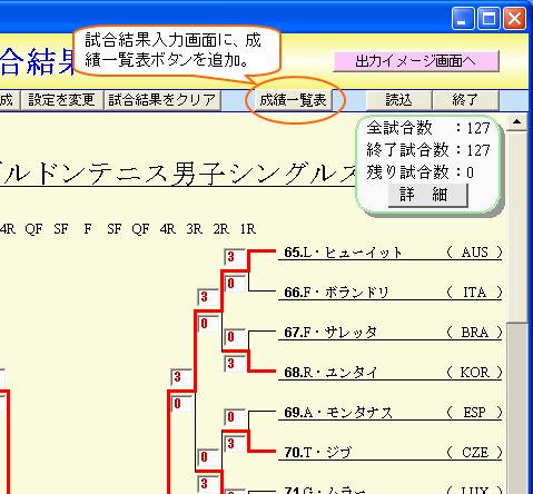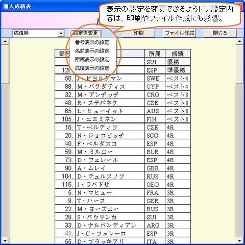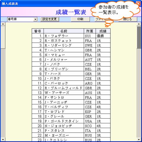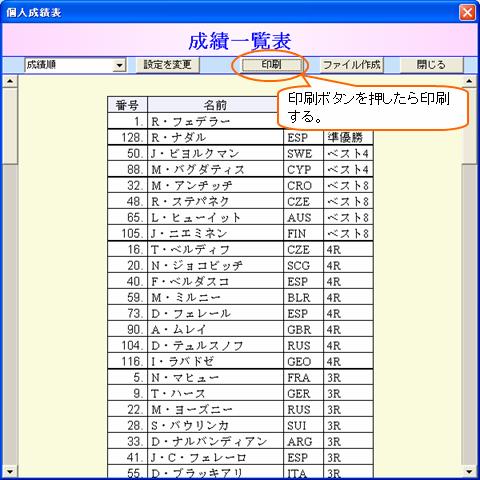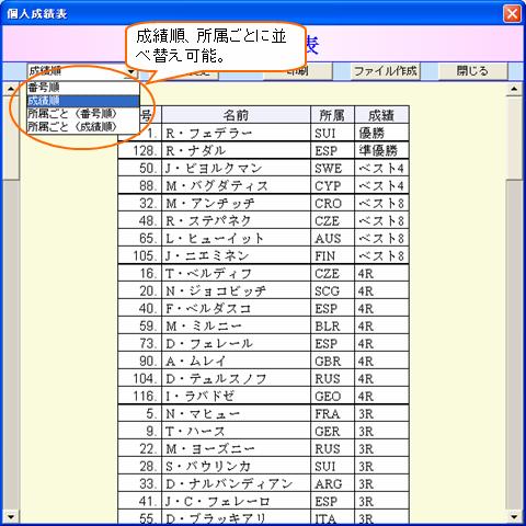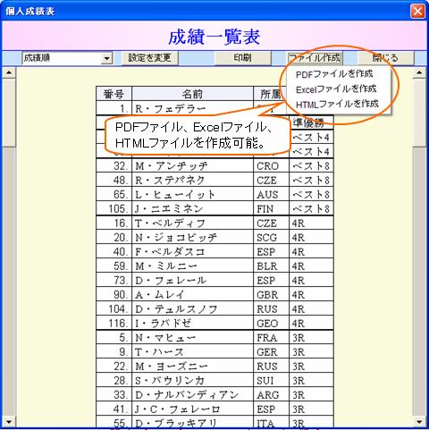 (参加者の成績、何ラウンドまで到達したかを一覧表示。印刷、PDFファイル作成、Excelファイル作成、