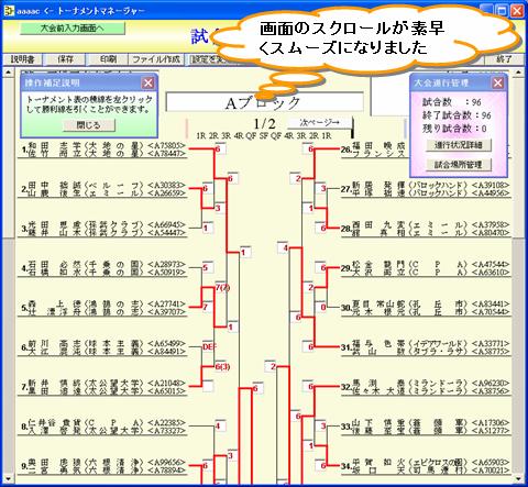 「自動抽選準備画面」「大会前入力画面」「試合結果入力画面」で、画面のスクロールが 素早くスムーズになるように改良。 (従来は、入力欄やボタンが多くある画面をスクロールさせると、動作が少し遅くなりスクロールが スムーズにいきませんでしたが、「入力欄やボタンを全て画面に置いておく」方式から 「入力欄やボタンの看板だけ表示しておく」方式に変更し、スクロールがスムーズに いくようにしました。)