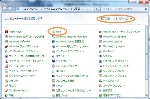 2、「Javaコントロール・パネル」を開く。(画面右上の方の「表示方法」を「小さいアイコン」にして一覧から選択するか、画面右上の「コントロールパネルの検索」欄に「java」と入力して検索する)