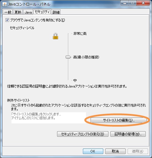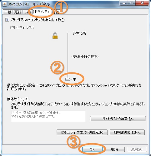 (Javaのバージョンによっては、セキュリティ・レベルで「中」という選択肢がない場合があります。