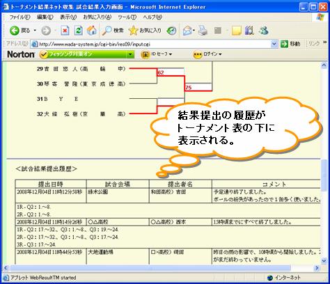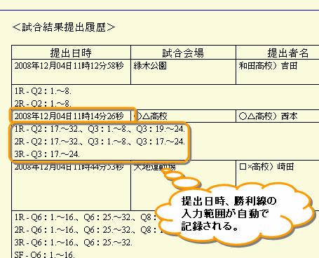 結果提出の履歴(提出日時、勝利線の入力範囲など)が蓄積され、試合結果入力画面の トーナメント表の下に表示されます。勝利線の入力範囲は自動で認識されます。 いつ、どの範囲の結果の入力が行われたかわかるので、結果入力状況の管理が しやすくなります。