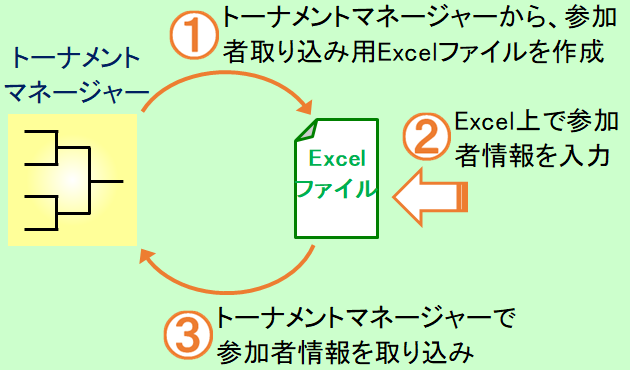 トーナメント表の形を作成した後でも、参加者をまとめて取り込むことが可能です。トーナメント表を作成後に参加者をまとめて取り込む場合は、名前欄と所属欄のどちらも入力されていない場所に配置されていきます(名前欄か所属欄のどちらかにすでに入力されている場所はそのままとなります)。