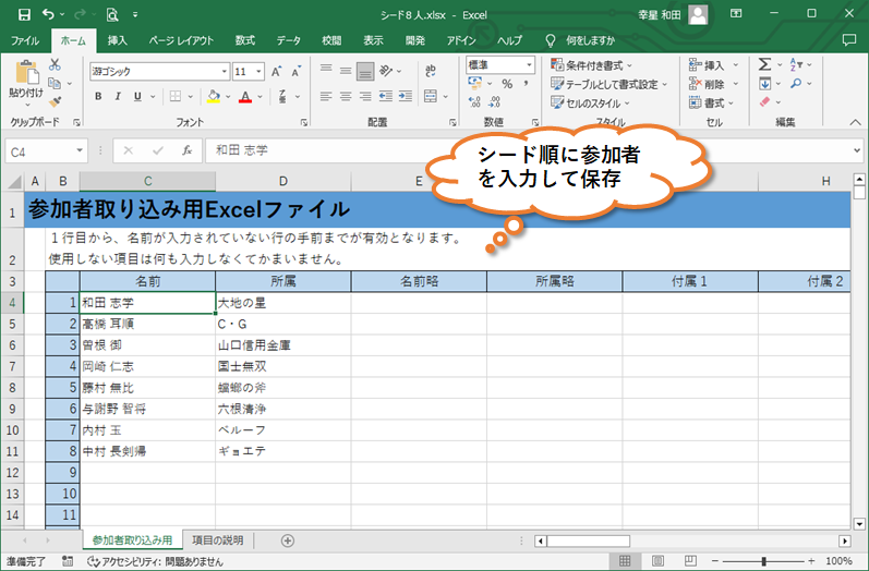 (最初に参加者を入力せずに)まずトーナメント表の形を作成した後でも、参加者たちをシード順に取り込むことが可能です。