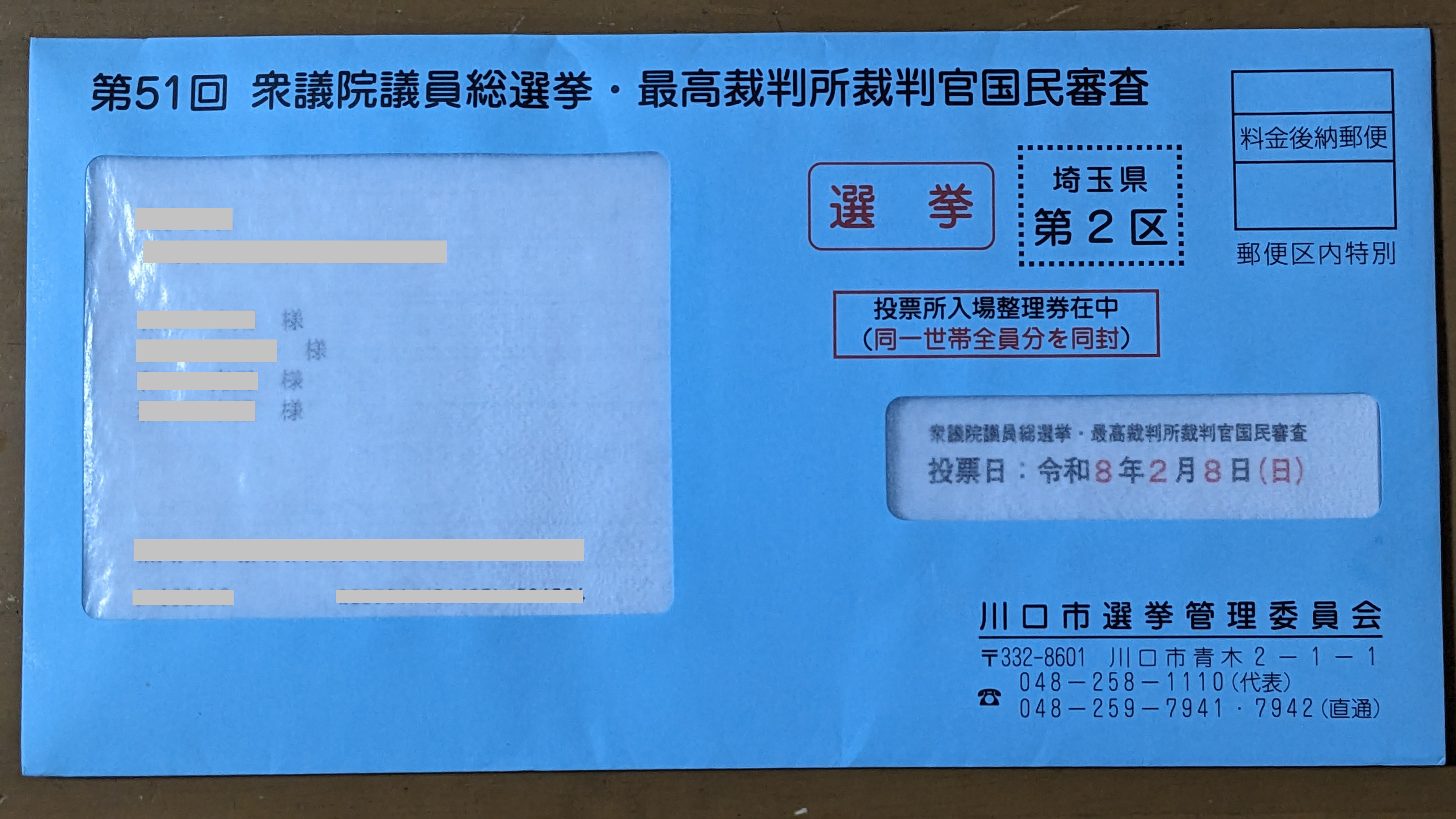 あっ、「投票所入場整理券」っていうのは一人ずつ個別に送られてくるんじゃあないんでしたっけ。